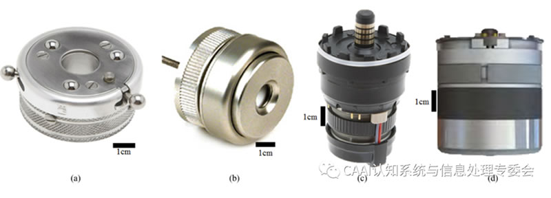 主動單自由度腕部通常在假肢和機器人應用中都能找到。在假肢L域,這些系統(tǒng)通常與EMG系統(tǒng)一起使用,使用戶能夠通過肌肉信號控制旋轉(zhuǎn);顒邮滞罂梢允仟毩⒌膯卧傻郊偈种,或者集成到較大假手中的前臂中。與被動手腕類似,主動單自由度裝置也可分為旋轉(zhuǎn)器和屈肌。主動旋轉(zhuǎn)器是腕部假體中常見的動力裝置。獨立設備包括運動控制電動旋轉(zhuǎn)器和OB腕部旋轉(zhuǎn)器,如圖(c)所示,這兩種設備都是為與許多終端設備兼容而設計的,因而得到了相對廣泛的應用。OB-Michelangelo手和TBi-Limb Quantum都使用緊湊的旋轉(zhuǎn)器,即軸旋轉(zhuǎn)和俯臥旋轉(zhuǎn)[圖(d)],它們分別安裝在各自手的假體窩和下手掌中,主動屈肌也往往納入現(xiàn)有的機器人手或終端設備系統(tǒng)。