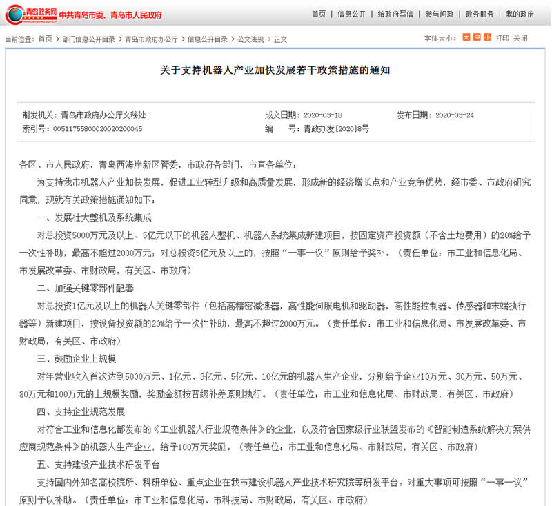 2020年3月18日,青島市政府辦公廳印發《關于支持機器人產業加快發展若干政策措施的通知》,出臺支持機器人產業發展的6大方面10條措施。這是山東省內出臺的D一個機器人產業政策,其政策優惠力度在全國J具競爭力。其中,在引進培育機器人整機及系統集成企業、鼓勵產品研發等方面,該政策創新力度實現新突破。